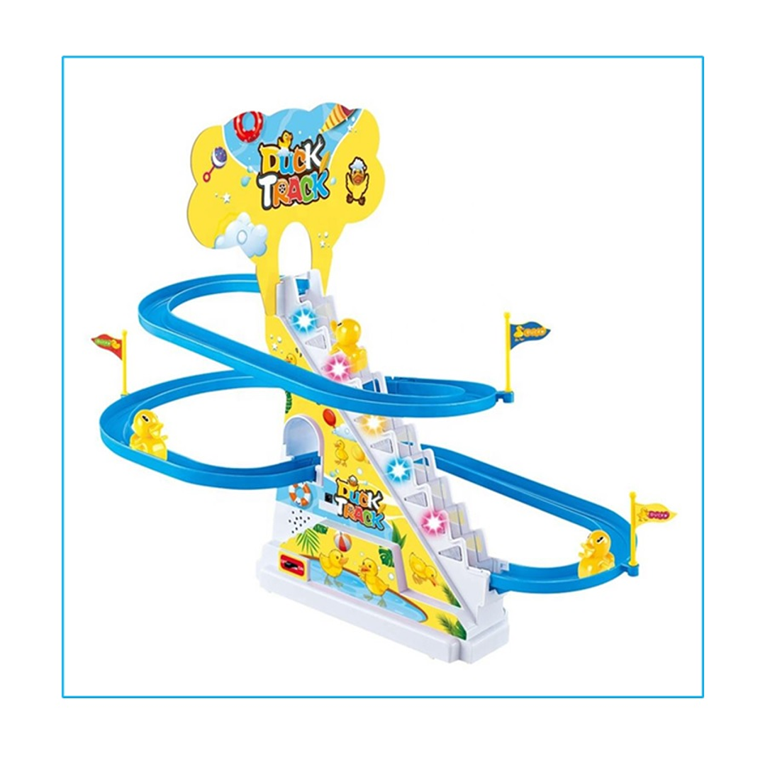 Juego de carreras de patos subiendo escaleras, es un juguete eléctrico con música y luz.