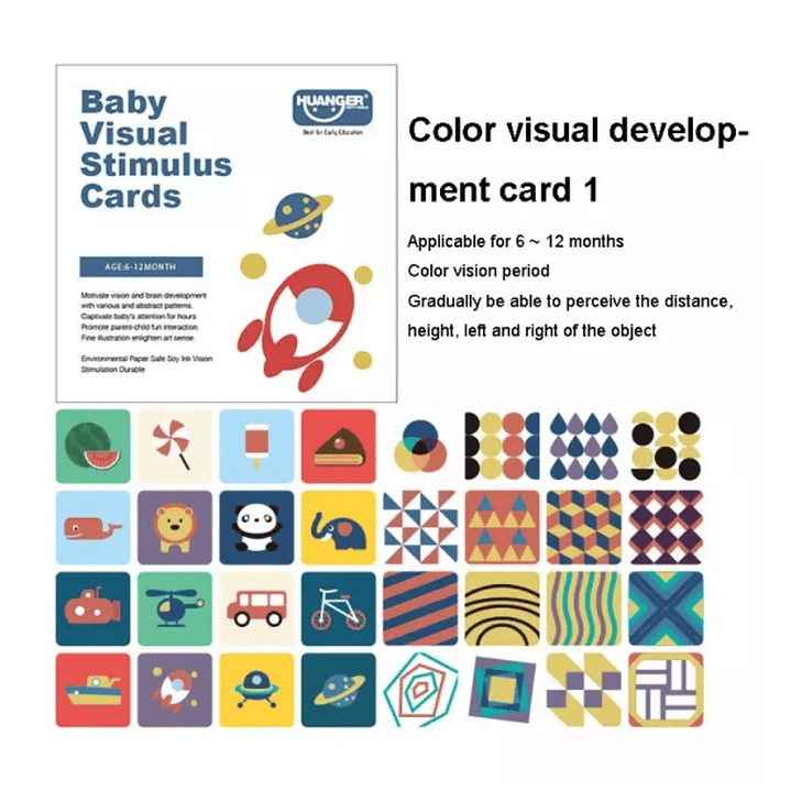 Etapa de 6 a 12 meses: Período de visión del color; iluminacion cognitiva. Tarjetas de estimulación multicolor, para bebes de 6 a 12 meses. Contienen coloridas imágenes que ayudan a desarrollar el discernimiento y la imaginación de niñas y niños. Tarjetas dobles (imágenes por ambas caras) con figuras abstractas y de objetos.