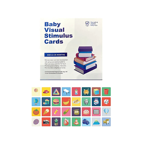Etapa de 6 a 12 meses: Período de visión del color; iluminacion cognitiva. Tarjetas de estimulación multicolor, para bebes de 6 a 12 meses. Contienen coloridas imágenes que ayudan a desarrollar el discernimiento y la imaginación de niñas y niños. Tarjetas dobles (imágenes por ambas caras) con figuras abstractas y de objetos.